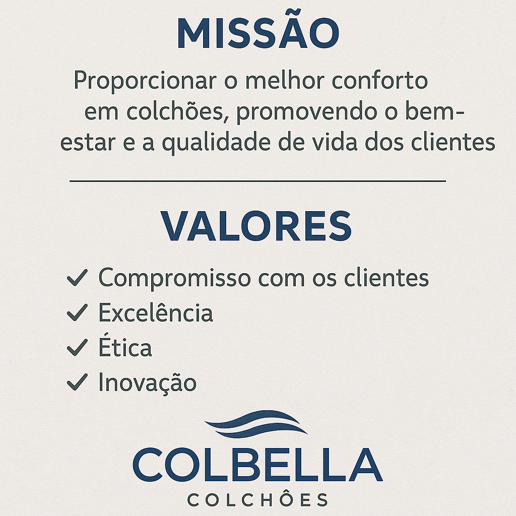 Proporcionar qualidade de sono acessĂvel, atravĂ©s da produção e comercialização de colchões com alto padrĂŁo de conforto, durabilidade e tecnologia, garantindo a satisfação total dos nossos clientes.